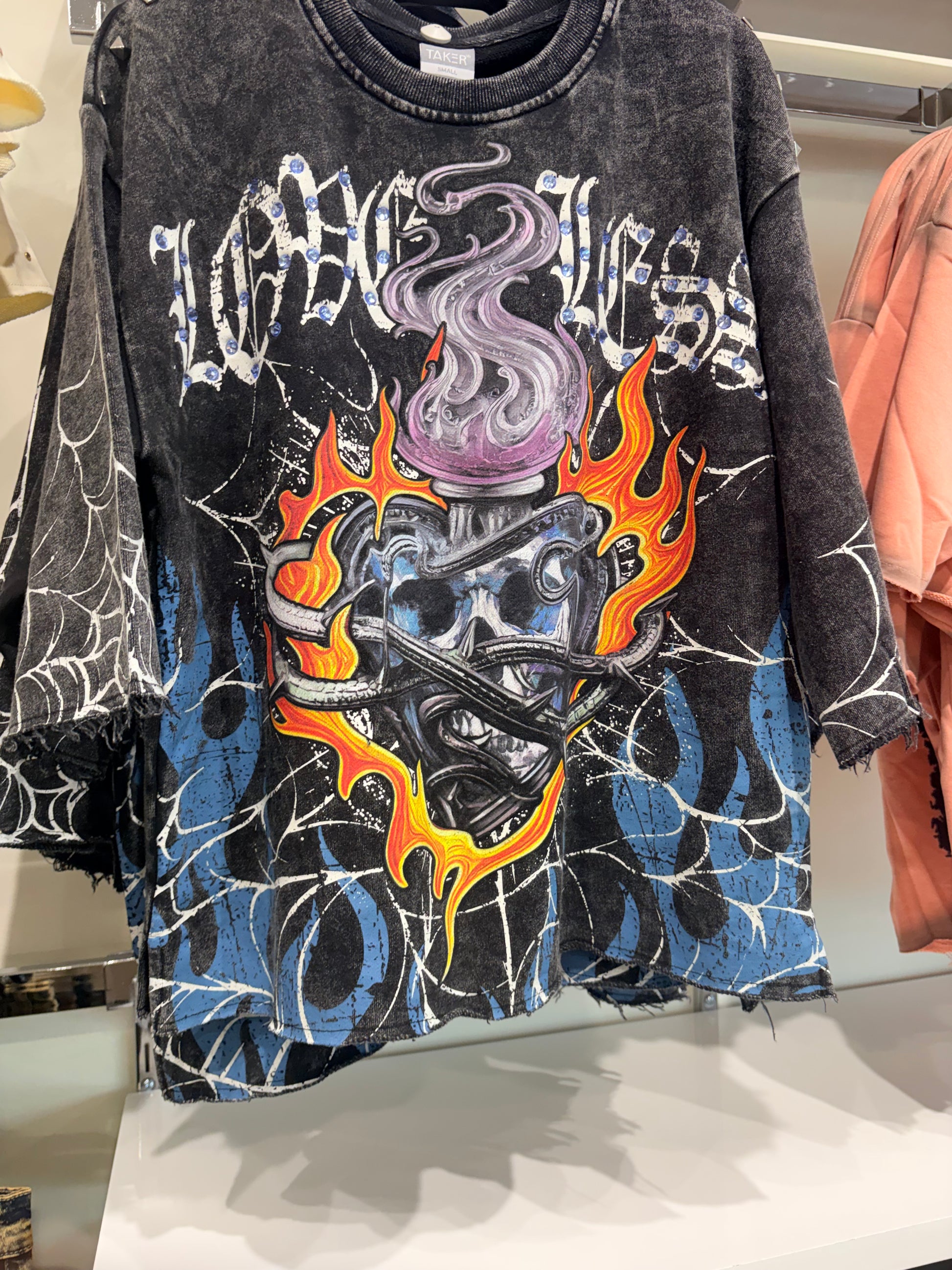 TAKER MEN’S CROPPED T-SHIRT WITH DIGITAL PRINT, PYRAMID STUDS & RHINESTONES