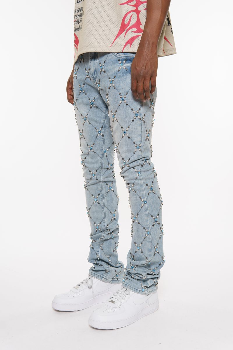 Vicious Men’s Light Blue Rhinestone Skinny Stacked Jeans