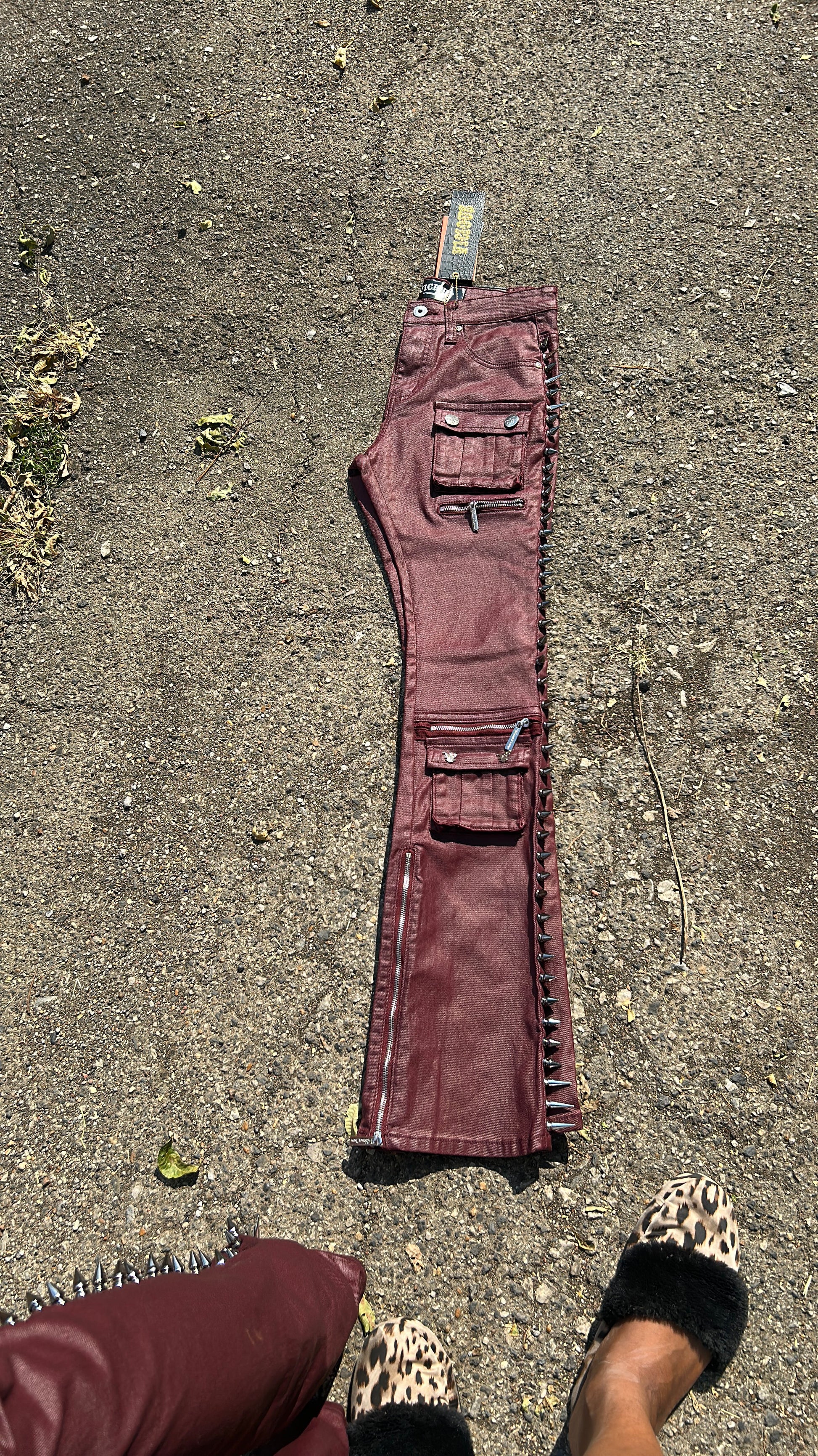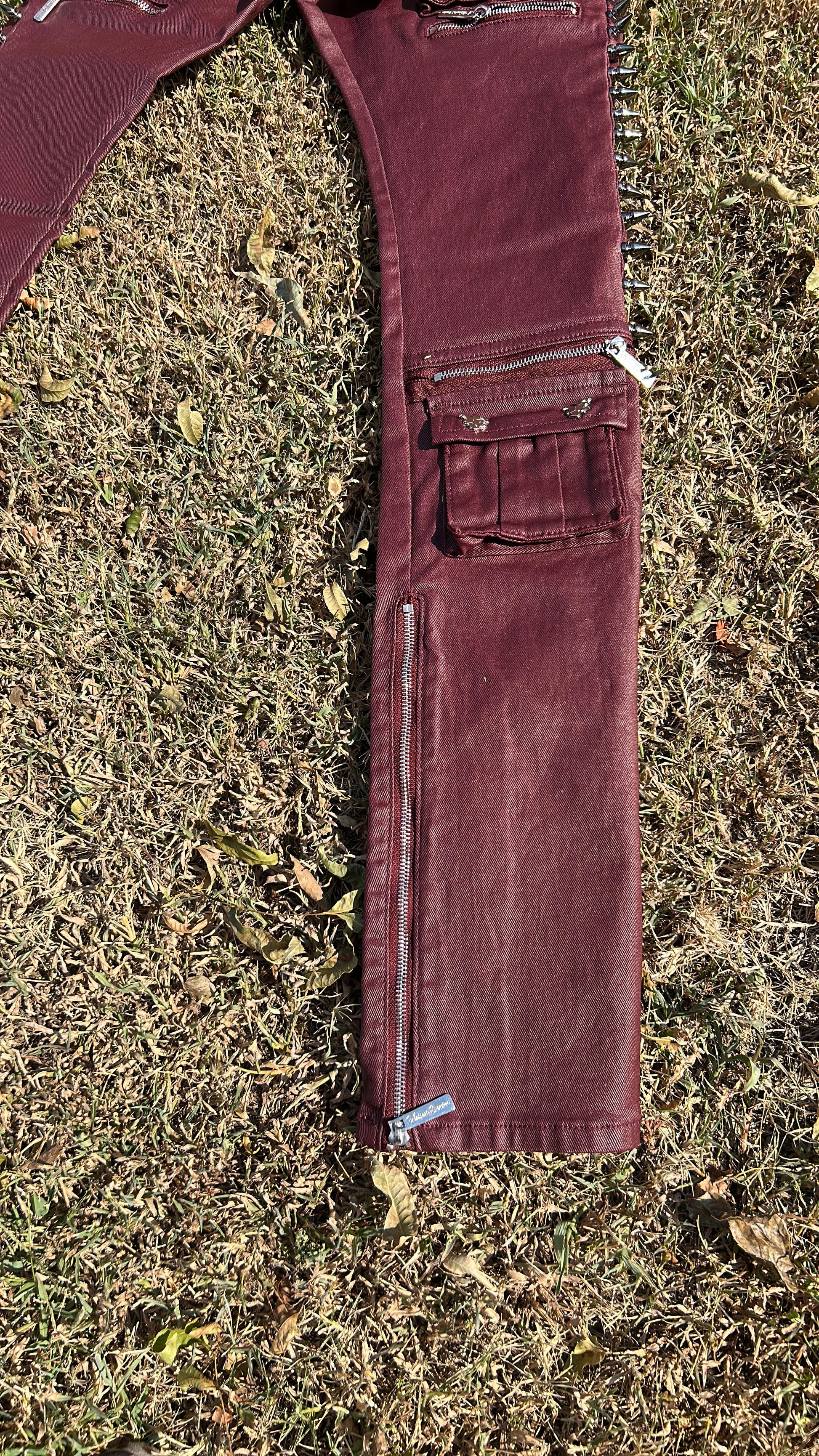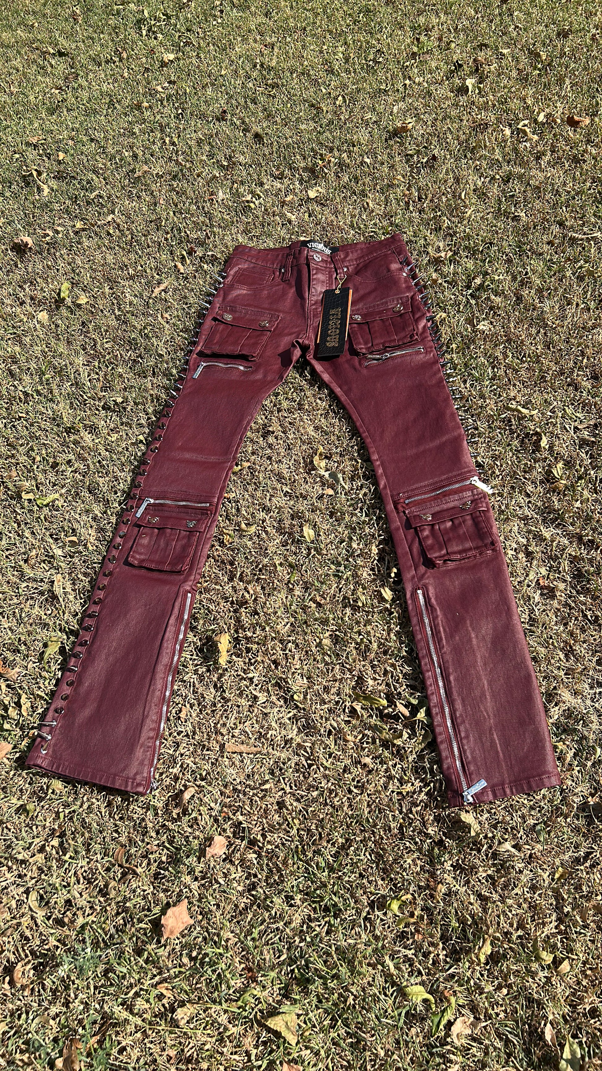 Vicious West Men’s Coated Burgundy Stacked Spiked Skinny Jeans